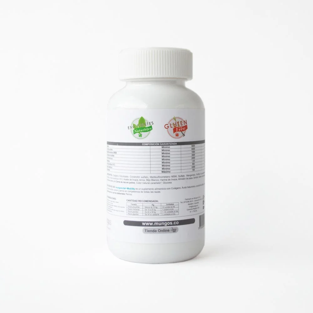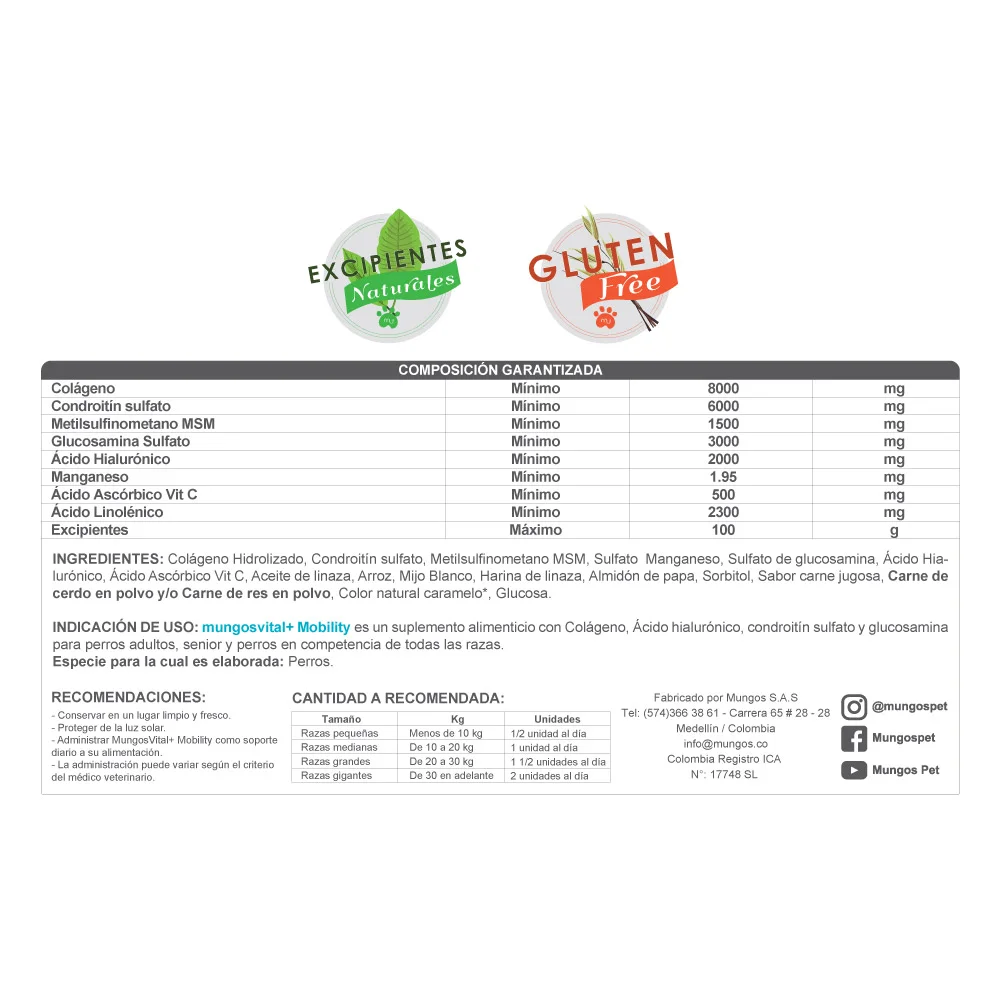 Ingredientes: Colágeno Hidrolizado, Condroitín sulfato, Metilsulfinometano MSM, Sulfato Manganeso, Sulfato Glucosamina, Ácido Hialurónico, Ácido ascórbico Vit C, Aceite de Linaza, Arroz, Mijo Blanco, Harina de linaza, Almidon de papa, Sorbitol, Sabor Carne Jugosa and Carne de cerdo en polvo y/o Carne de Res en polvo, Color Natural Caramelo, Glucosa.